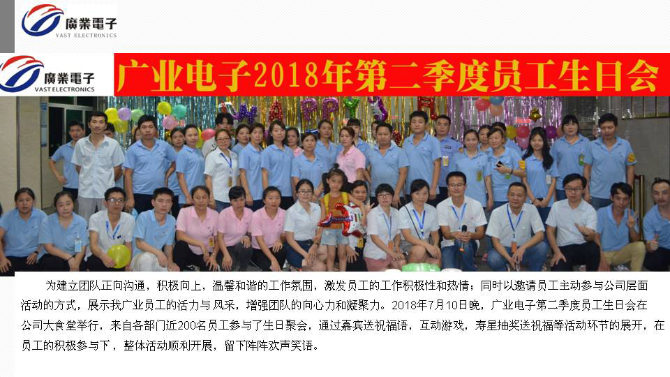 為建立團(tuán)隊(duì)正向溝通,積極向上,溫馨和諧的工作氛圍,激發(fā)員工的工作積極性和熱情;同時(shí)以邀請員工主動參與公司層面活動的方式,展示我廣業(yè)員工的活力與 風(fēng)采,增強(qiáng)團(tuán)隊(duì)的向心力和凝聚力。2018年7月10日晚,廣業(yè)電子第二季度員工生日會在公司大食堂舉行,來自各部門近200名員工參與了生日聚會,通過嘉賓送祝福語,互動游戲,壽星抽獎(jiǎng)送祝福等活動環(huán)節(jié)的展開,在員工的積極參與下 ,整體活動順利開展,留下陣陣歡聲笑語。